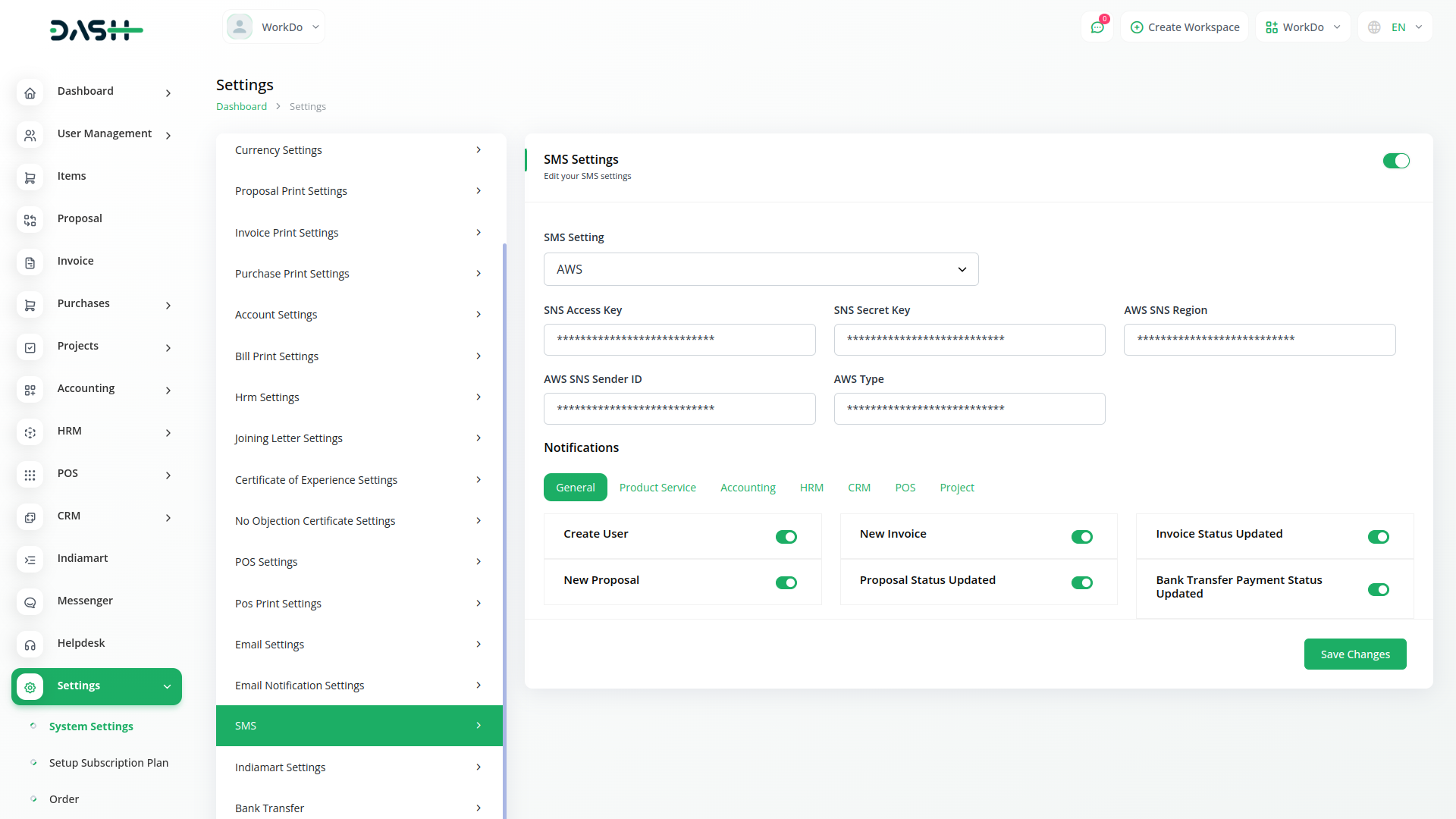 Receive immediate notifications of vital updates, notifications, and alerts directly to your mobile device via SMS. Stay informed about crucial events wherever you are, ensuring you never miss an important message. Getting started is simple - just input your SMS gateway information in the settings page, then toggle notifications on or off according to your preferences. Stay connected and informed with Workdo Dash/s SMS Module.